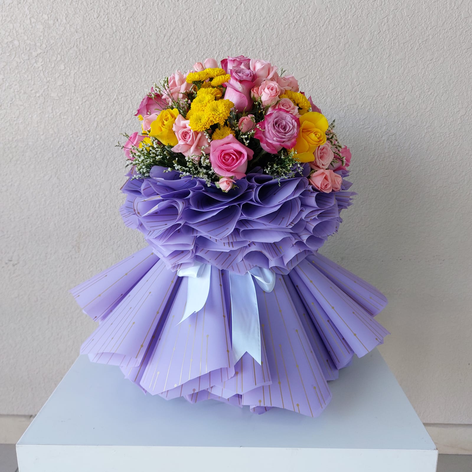 Special assorted purple flowers bouquet with unique wrapping perfect for many occasions