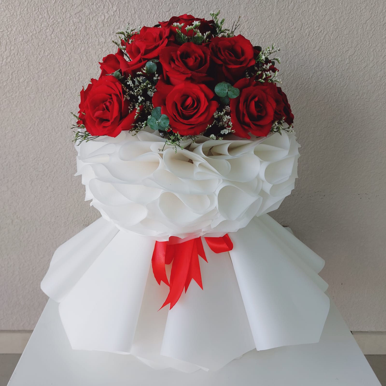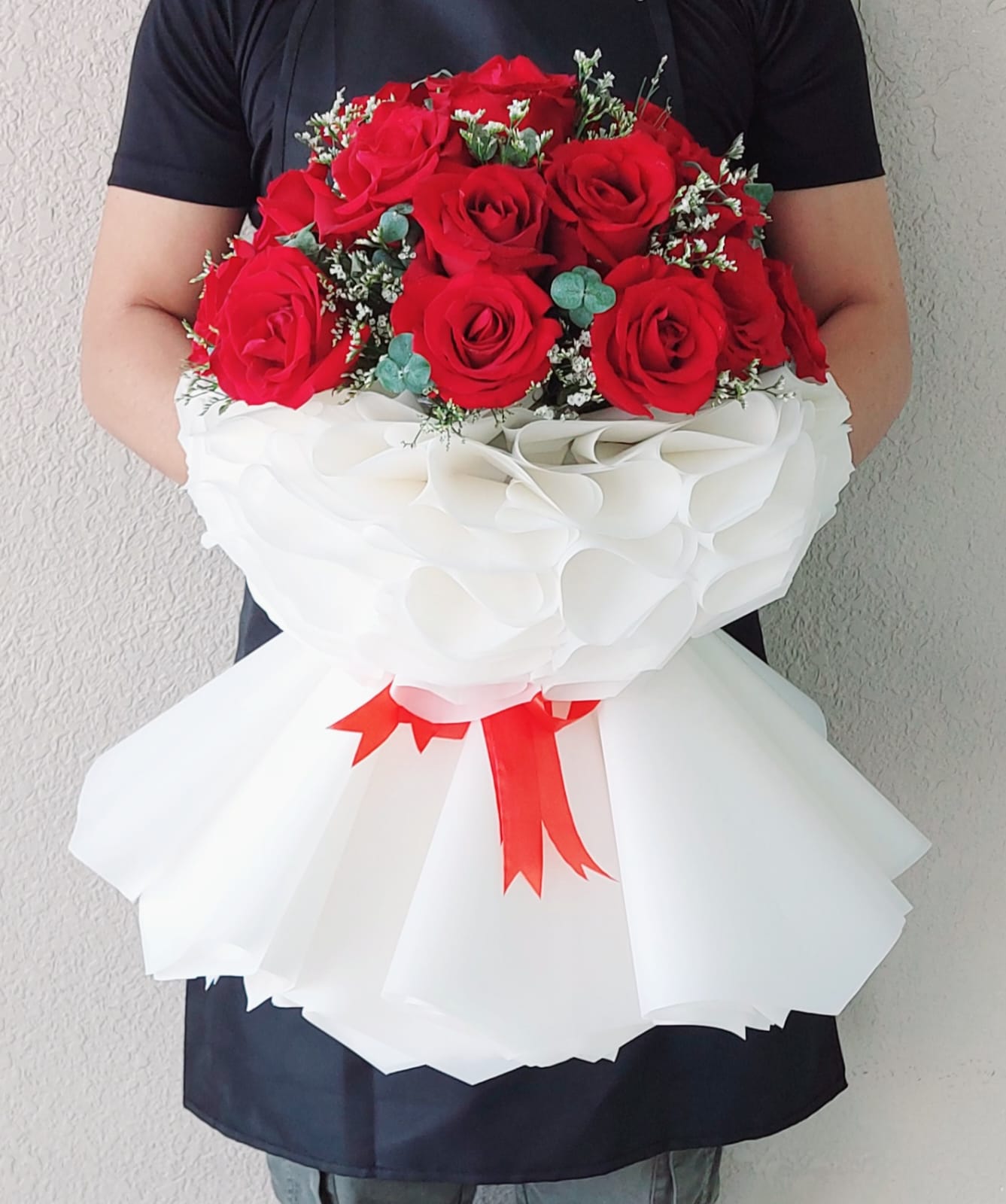 Amazing new design of red flowers bouquet with beautiful white wrapping lerfect for birthdays, anniversary, new years and all romantic occasions.
